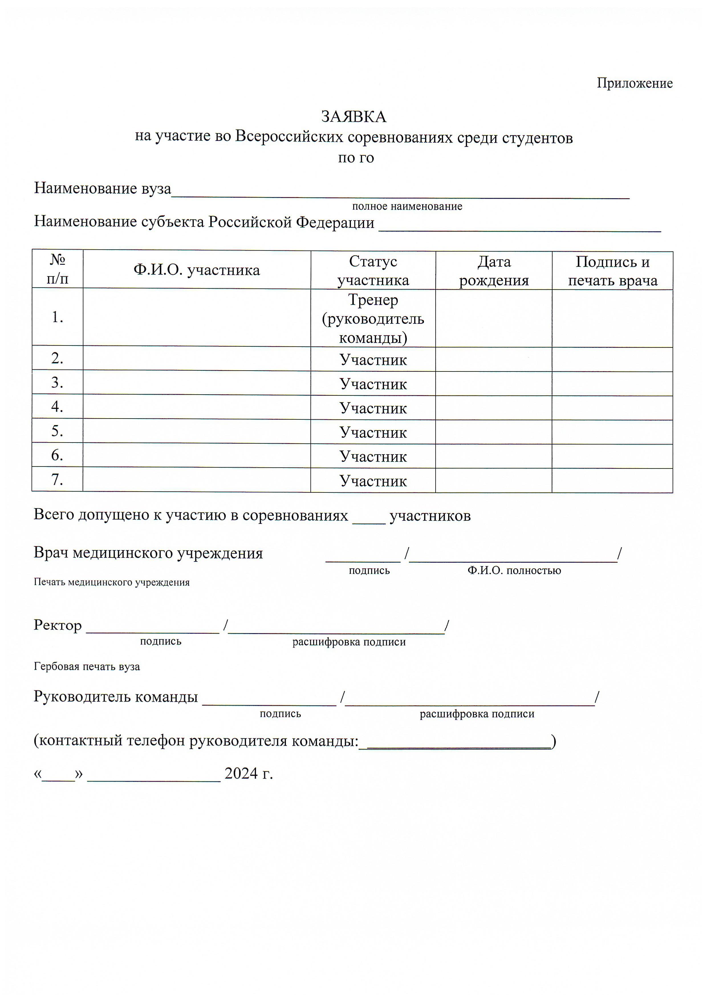 – заявка по форме согласно Приложению, заверенная подписью врача, печатью медицинского учреждения, подписью ректора (директора) образовательной организации и печатью образовательной организации;