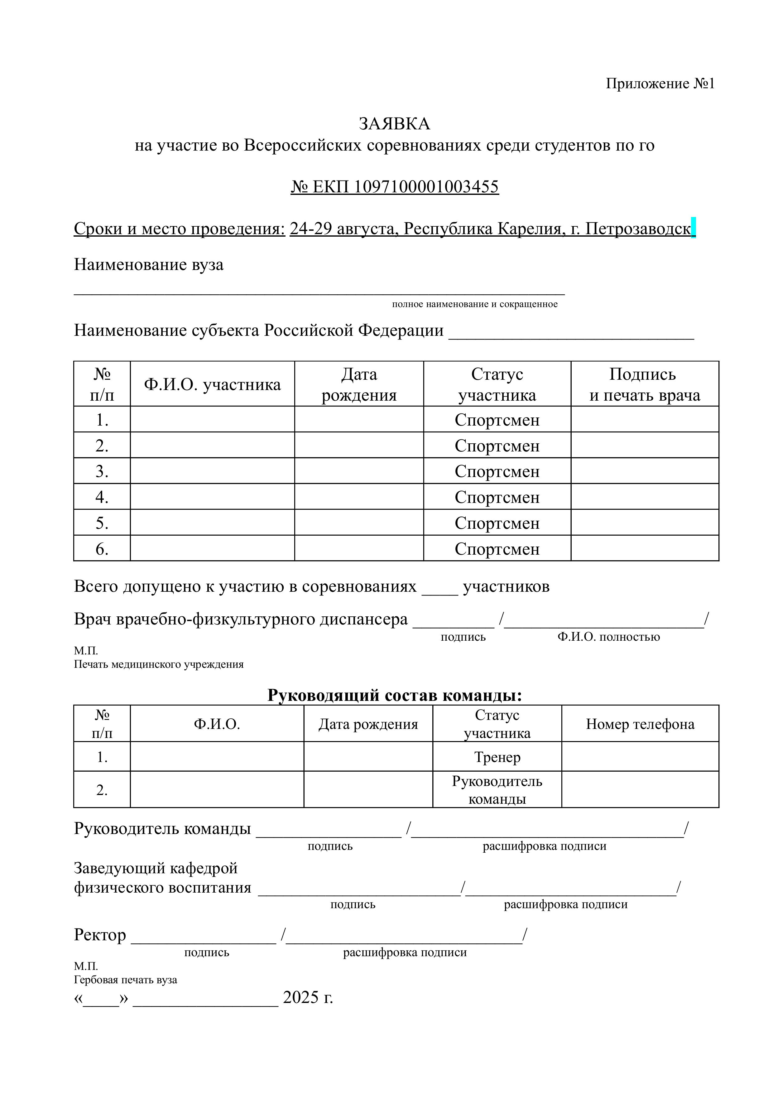 заявка по форме согласно Приложению №1 с отметкой «допущен»и подписью врача напротив каждого спортсмена, заверенная подписью врача, печатью медицинского учреждения, подписью ректора (руководителя) образовательной организации и печатью образовательной организации;